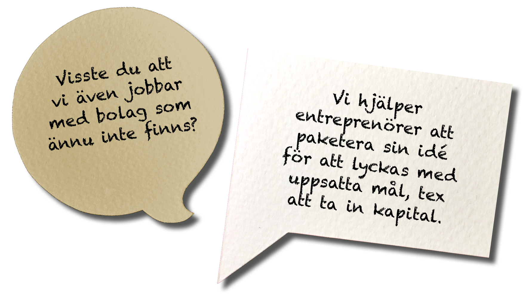 Oavsett om du är entreprenör med en ny idé eller företagsledare som vill expandera till nya marknader, lansera en ny produkt eller slå samman varumärken, vi hjälper dig hela vägen. Vi bygger även investeringscase för affärsidéer som behöver kapital.