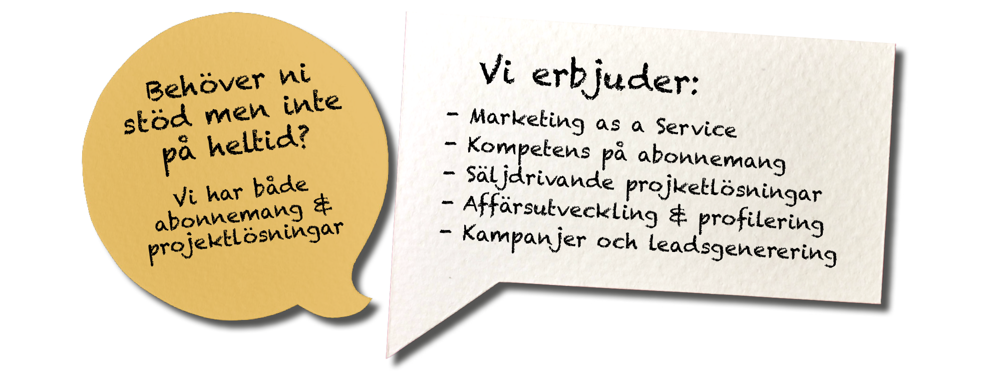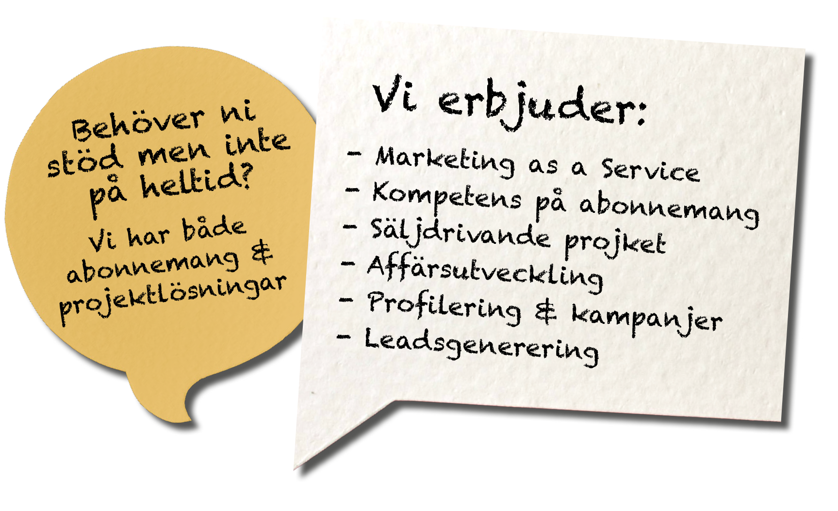 Vi förstår utmaningarna och vet hur de övervinns. Med 20+ års erfarenhet av ledande roller inom affärsutveckling och marknadsföring i varierade branscher skräddarsyr vi det stöd som passar er. Vi kombinerar strategiskt tänk med operativt genomförande och levererar alltid mycket hög kvalitet. → Mer om oss hittar du här.