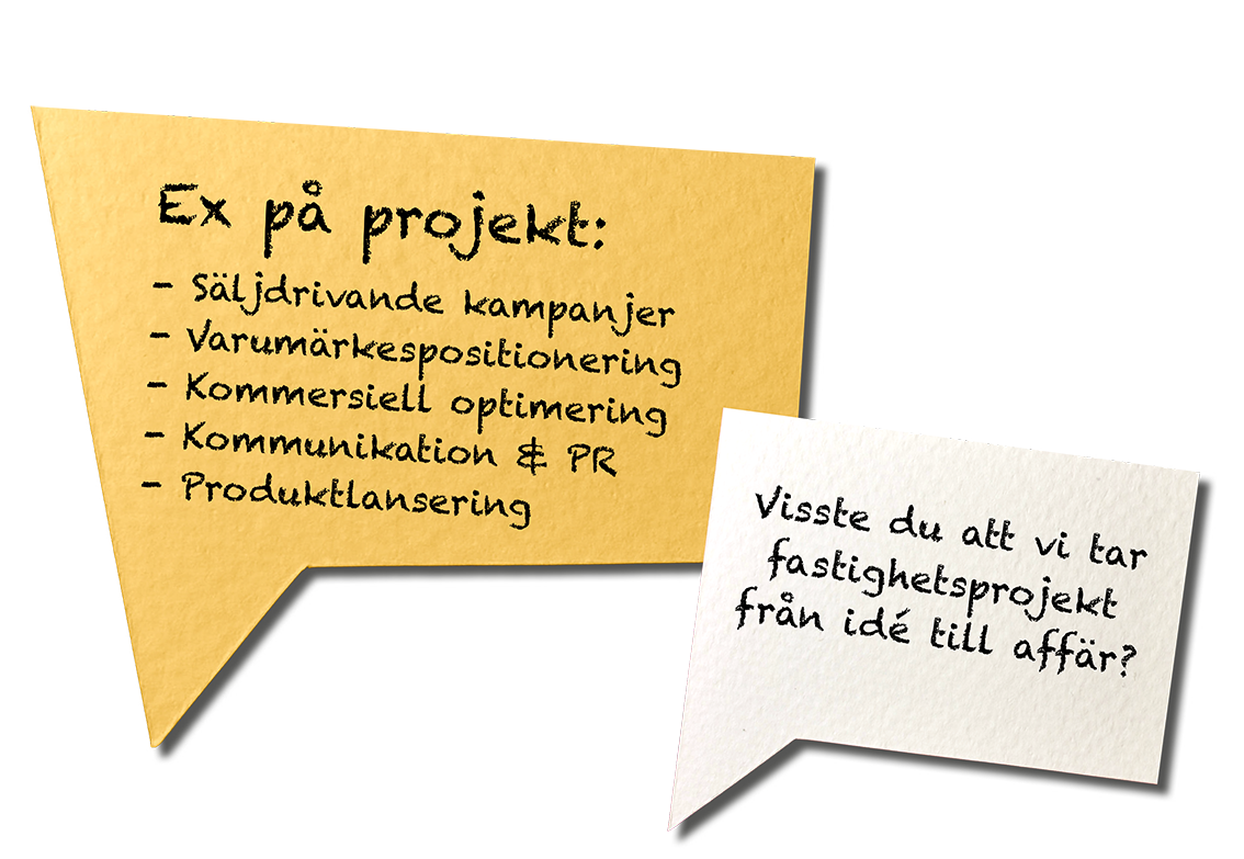 Oavsett inriktning på projekten är målet alltid detsamma – att skapa mätbara resultat och högre lönsamhet. Vi driver projekt som tillväxtstrategier, positionering, kundresor, lojalitetsprogram, tjänsteutveckling, produktlanseringar, varumärkesutveckling, kampanjer, leadgenerering och kommersiell optimering.