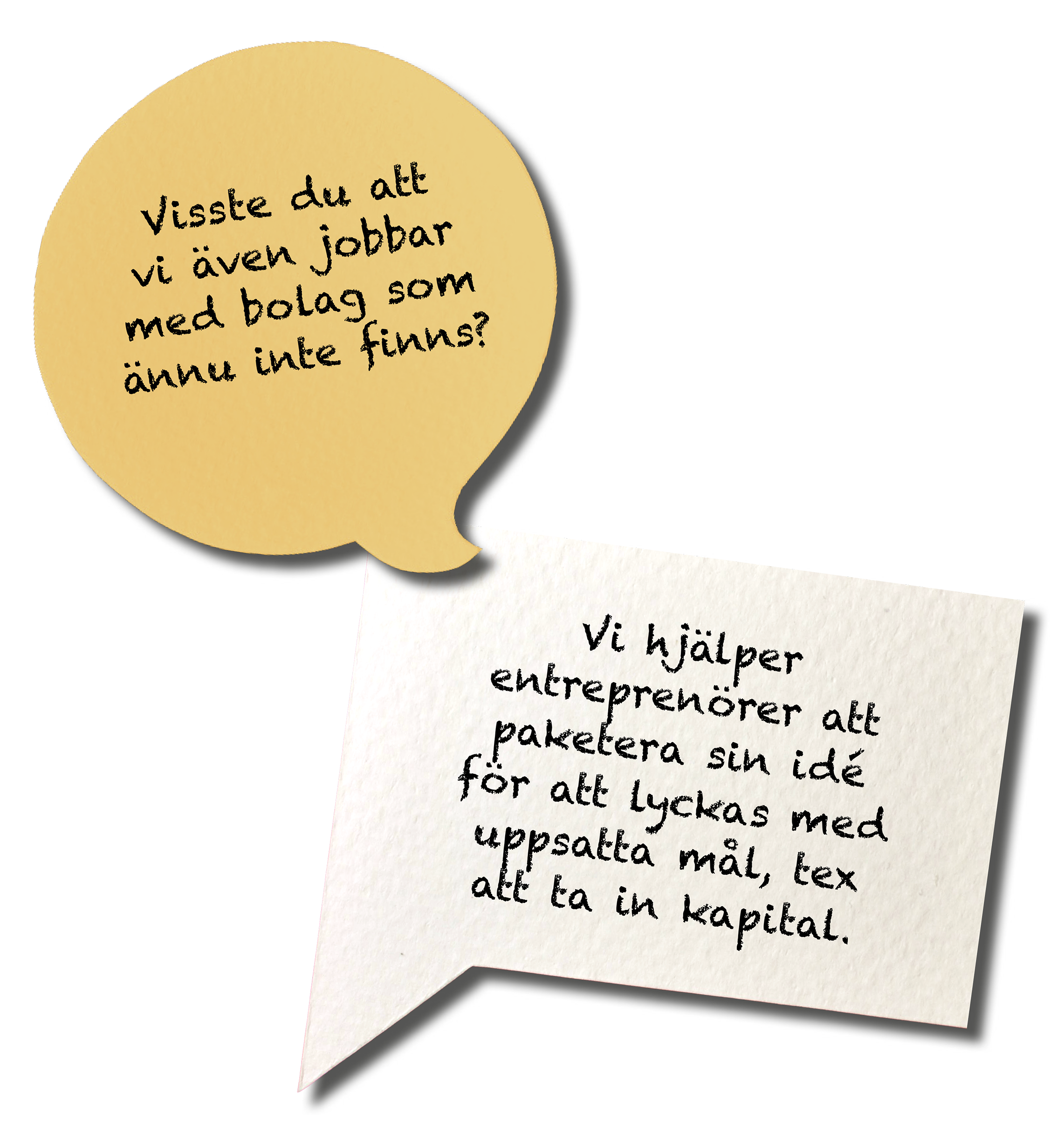 Oavsett om du är entreprenör med en ny idé eller företagsledare som vill expandera till nya marknader, lansera en ny produkt eller slå samman varumärken, vi hjälper dig hela vägen. Vi bygger även investeringscase för affärsidéer som behöver kapital.